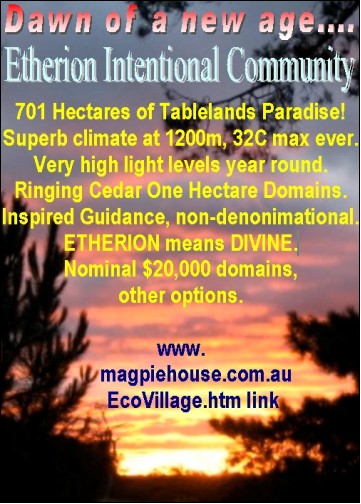 * "ETHERION" means Divine, see http://www.magpiehouse.com.au/EcoVillage.htm for information, contact details, photos, & the Etherion story so far (read the article "Eco-Villages & Anastasia's 'Truth' about Rising Seas").
