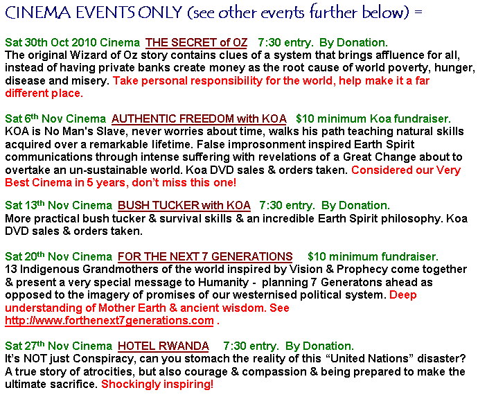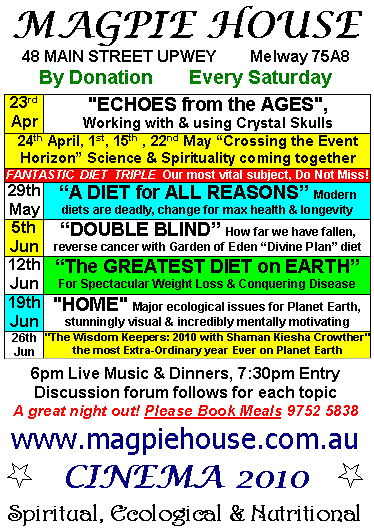 8. Sat 26 June Cinema "The Wisdom Keepers: 2010 with Shaman Kiesha Crowther". 2010 is the year we are supposed to Get It - the most Extra-Ordinary year Ever on Planet Earth! And it will get more & more extra-ordinary from there.