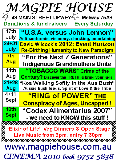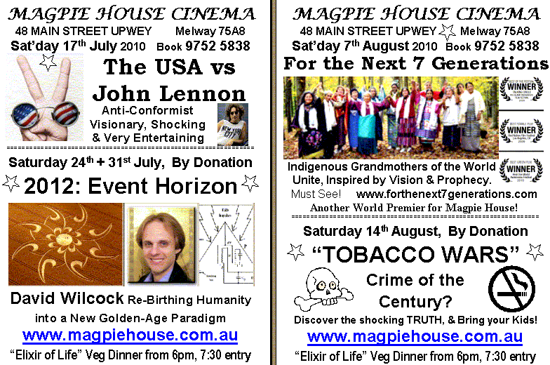 1. Cinema "The USA versus John Lennon", an inspired non-conformist visionary, shocking revelations & VERY entertaining! This Saturday 17th July , "Elixir of Life" Veg Dinners & Open Stage Live Music from 6pm, 7:30pm entry. By Donation.