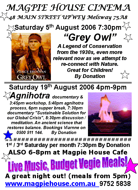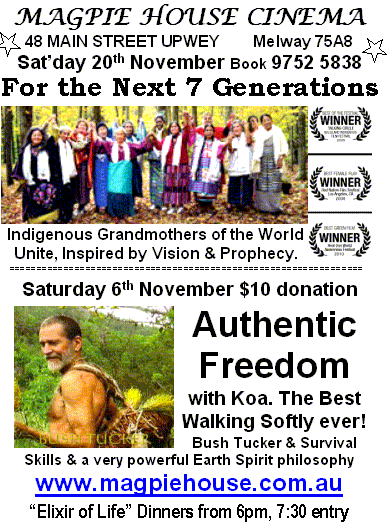 5. Saturday 7th August Cinema "For the Next 7 Generations", 13 indigenous grandmothers unite inspired by vision & prophecy with prayers to share for planetary healing & reconciliation. Magpie House is proud to be part of the World Premier screenings in this multi award-winning documentary.