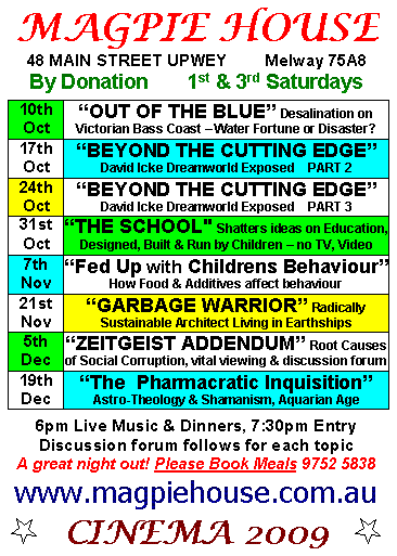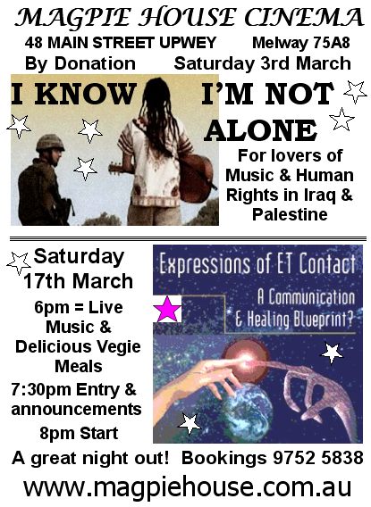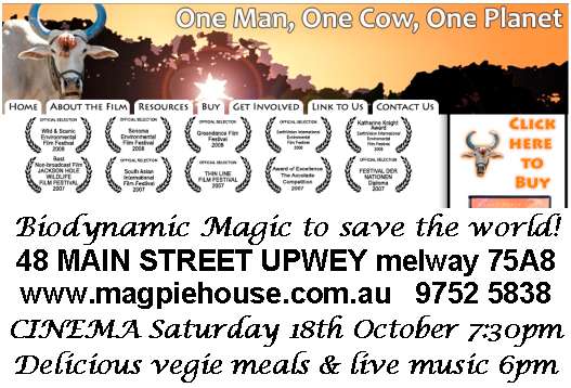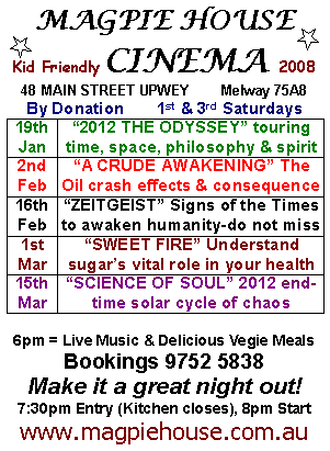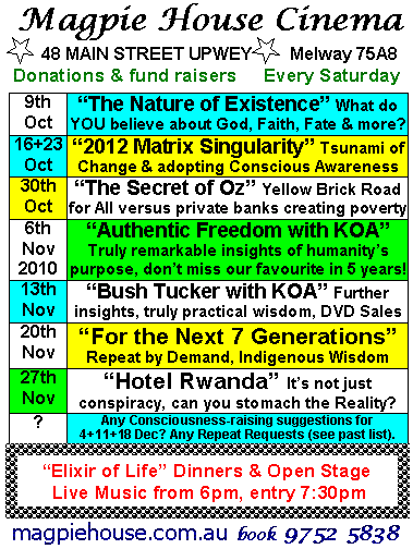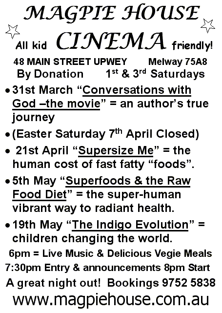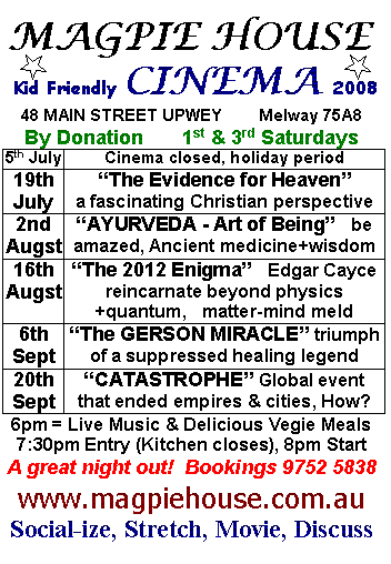 ALL EVENTS SUPPORTED by "ELIXIR of LIFE" dinners, delicious & nutritious light vegetarian meals. PLEASE BOOK on 03 9752 5838, or reply to this email.