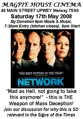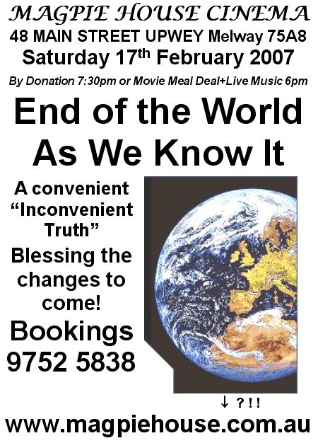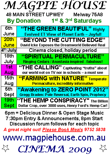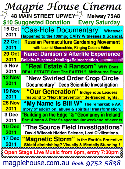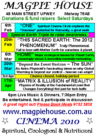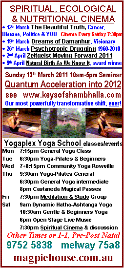 2011 is the year we're supposed to "get it" & all that is hidden will be revealed, preparing us for the transformative energies of 2012 - Wisdom Keepers Magpie House cinema June 2010. More indicators listed further below. Term 1 2012 Cinema & Events =