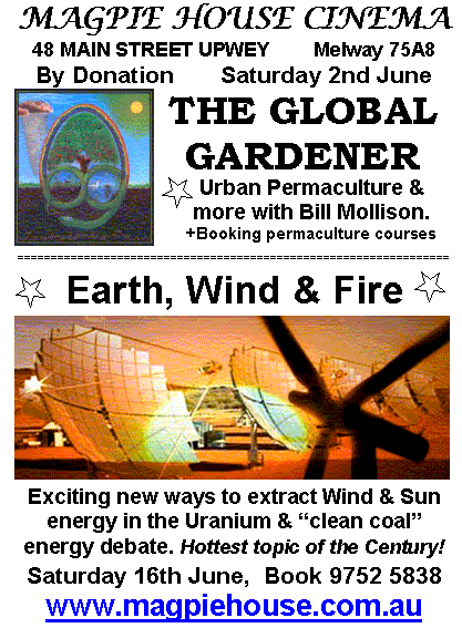 6. Fri 25th June Permaculture Revolution! - disguised as Gardening. Insightful Lecture & part viewing of the newly comprehensive Permaculture Design course on DVD. Full DVD course available for sale or a full viewing opportunity next term at Magpie House.