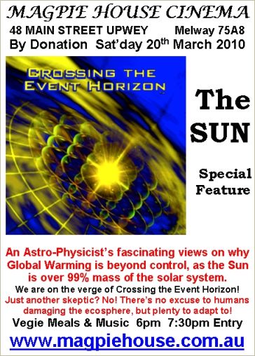 Cinema Saturday 24th April "CROSSING the EVENT HORIZON part 1 - The Search for the Fundamental Pattern". Science & Spirituality at last come together in this new, comprehensive Unification theory, truly, we are all one! We are on the verge of Crossing the Event Horizon.