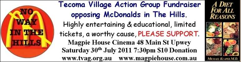 Saturday 29th May 9am-10am FOOD-SWAP-MEET, Locally-grown chemical-free fruit, vegetables, plants, seeds, and seedlings, new stalls welcome in an indoor-outdoor Cafe atmosphere. Introductory Fee = just 10% sales+swap value, minimum $1 per stall. Bring your home-grown excess produce to swap-share-meet with your local community, WITHOUT * Oil for transport & production, * throw-away packaging & other Materials Economy aspects, * pesticides, * herbicides, * commercially modified for profit * NOT for your HEALTH! Call Michelle Jones on 0409 52 6862 to book your stall, or just attend.