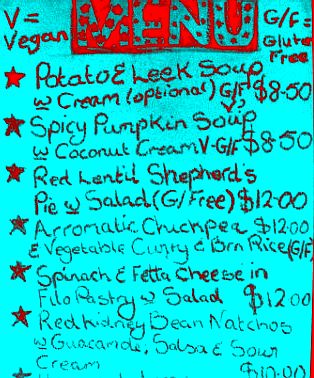 Typical Wholistic Cinema Menu - 6:30pm meals, Cinema entry 7:30pm.