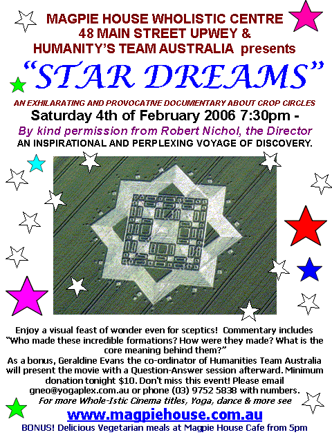 Magpie House takes the view that ALL titles screened over six years are chosen for us & we merely facilitate. The UFO/Crop Circle titles listed below appeared randomly from different sources as if on cue, & included the ASTOUNDING statement from the intensively active 1950s = "We Will Be Back in 2012". So, Why 2012? See website for movie trailers.